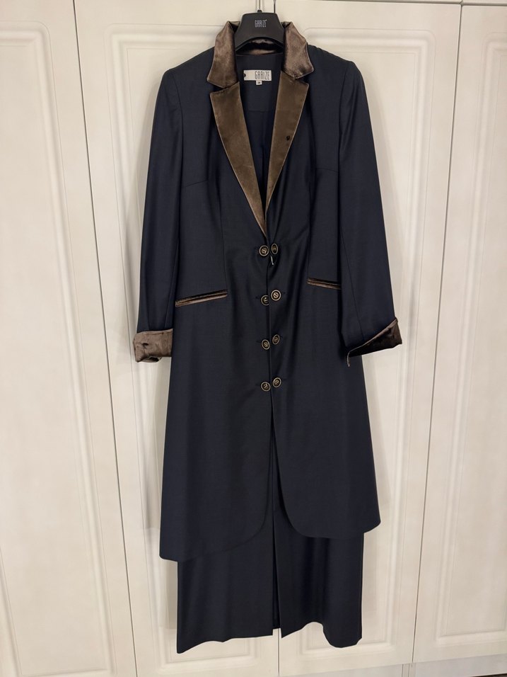 Kahverengi, uzun, düğmeli, klasik kesim kadın takım Notlu yaka, uzun kollu ve ipeksi kumaştan, modern klasik ofis tarzına uygun.