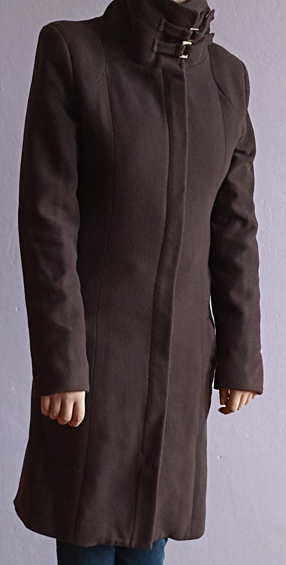 Kahverengi kaban, uzun kollu ve vücuda oturan kesime sahip, yumuşak ve sıcak kumaştan yapılmış kaban.
