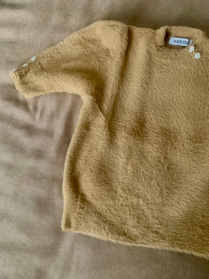 Sadece iki kere giydiğim ve biraz küçük geldiği için sattığım yumuşacık kahverengi boyun ve kolları düğme detaylı kazak.