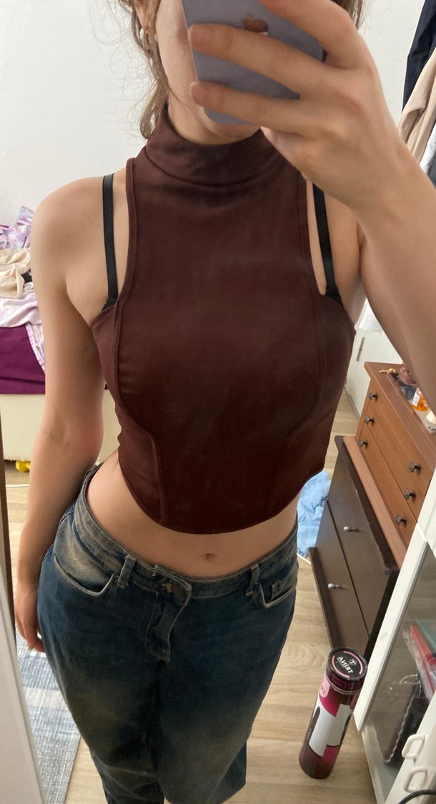 Kahverengi süet kumaştan, yüksek yakalı ve kolsuz, vücuda oturan kadın bluz. Midi uzunlukta, desensiz ve günlük sokak stiline uygun, zahmetsiz şıklık sunar.