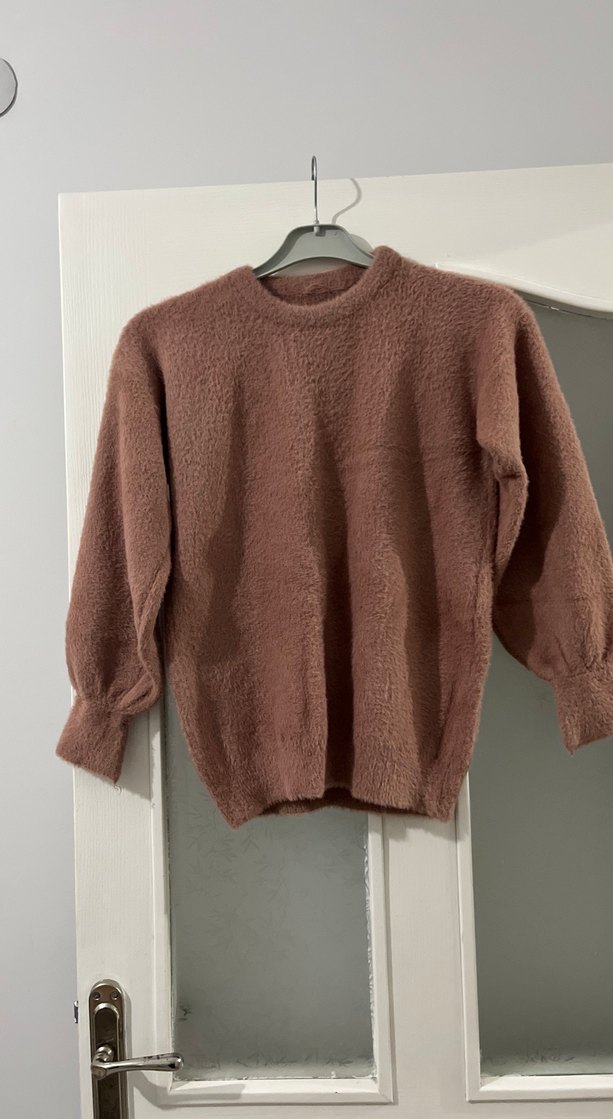 Kahverengi, yumuşak dokulu, bisiklet yaka ve uzun kollu, bol kesim normal midi uzunlukta kadın triko kazak. Sıcak tutan kumaştan üretilmiştir.
