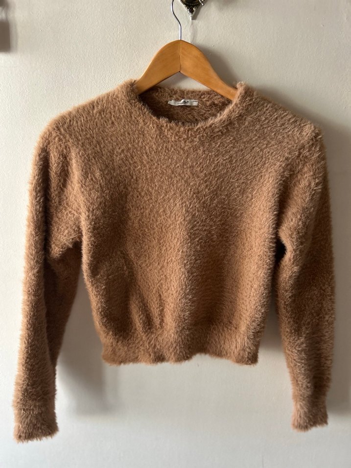 Kahverengi yünden örülmüş, uzun kollu, bisiklet yaka ve midi boyda, vücuda oturan kadın kazak. Günlük sokak giyimine uygun yumuşak dokulu. S-Xs bedebe uygundur. Herhangi bir defosu yoktur