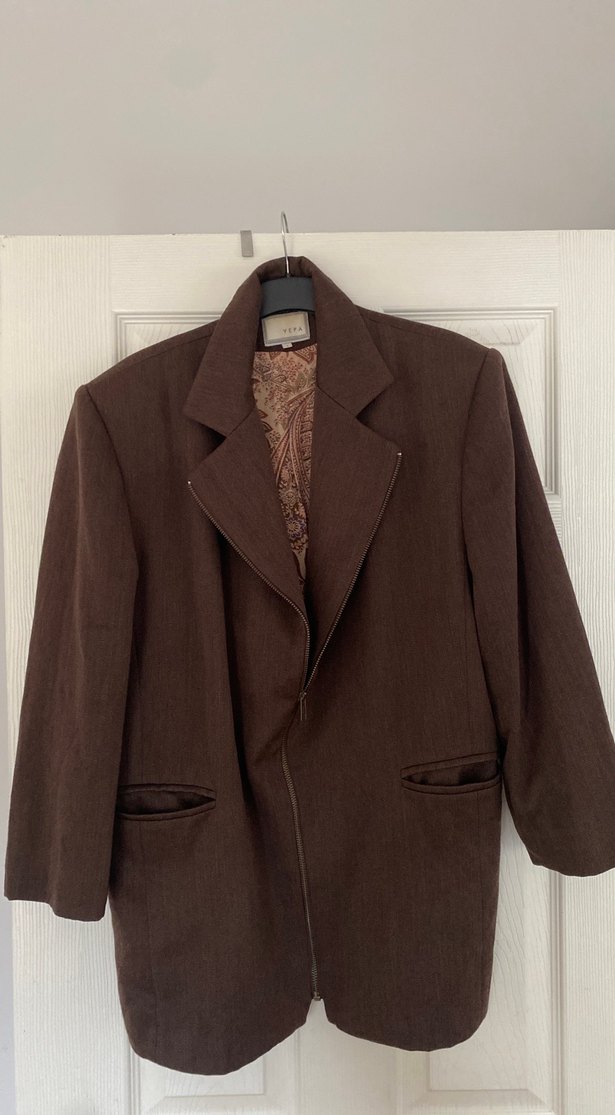 Kahverengi yünkumaştan, fermuarlı ve uzun kollu kadın blazer ceket. Klasik kesim ve modern tarzıyla ofis kullanımı için uygundur. Ürün içi astarlı çok güzel üstü yünlü yandan cepleri vardır gayet iyi durumdadır kuru temizleme yapılmıştır fermuar detayı yakaya kadardır isterseniz üstte de çekebilirsiniz 38 ve 40 bedene uygundur vatkalıdır