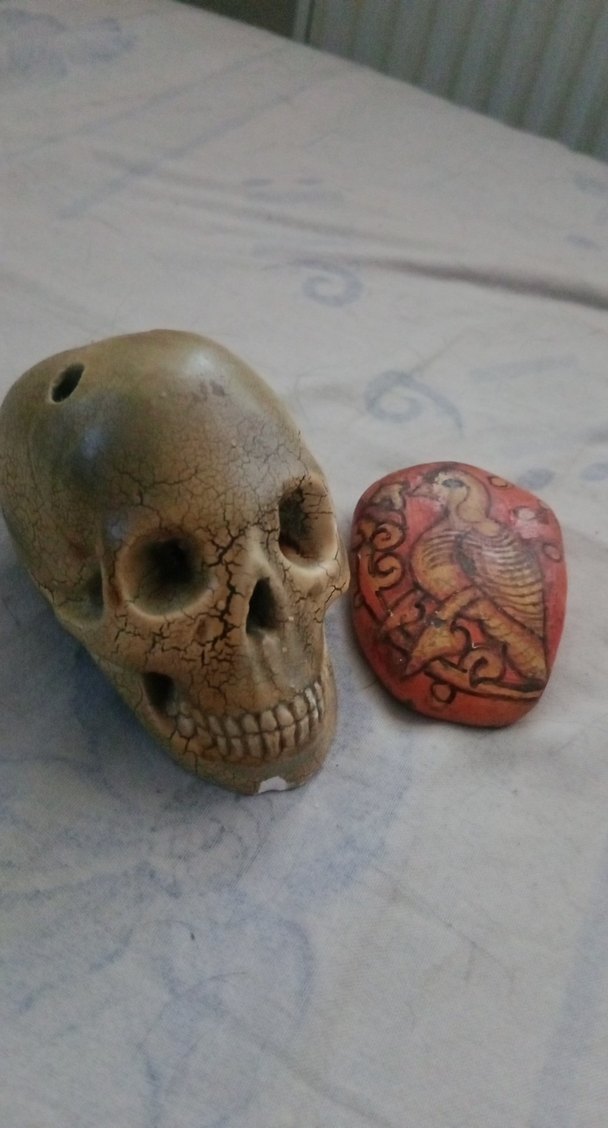 Kahverengi çatlak dokulu bir kafatası figürü ve üzerinde kartal kabartması bulunan ayrı bir parça. Antika görünümlü dekoratif ürünler.