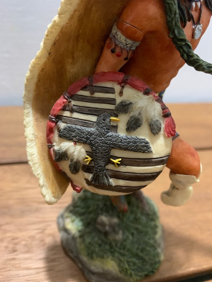 Kahverengi tonlarında bir figür, siyah kuş ve tüylerle süslenmiş kalkan tutuyor, dokulu yeşil bir kaide üzerinde duruyor.