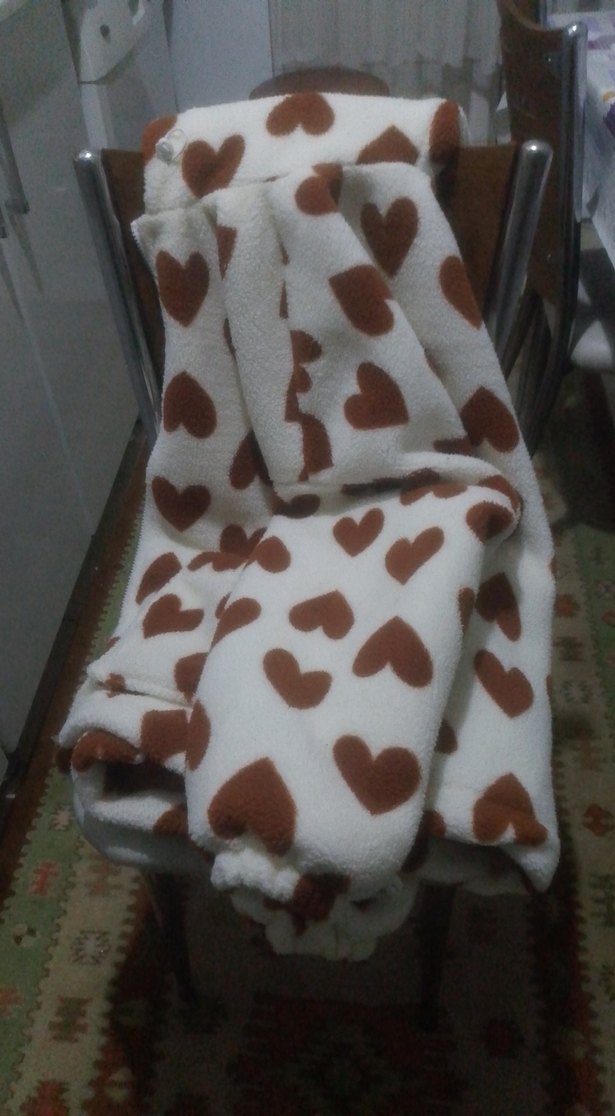 Yumuşak ve sıcak kumaştan, açık kahverengi kalp desenli çocuk battaniyesi. Çocuklar için rahat bir kullanım sunar.