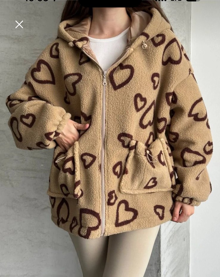 Kalp desenli, kahverengi kısa uzunlukta kadın ceket. Yumuşak ve sıcak kumaş, kapüşonlu, uzun kollu ve bol kesimdir. Rahat ve şık sokak stili için uygundur.