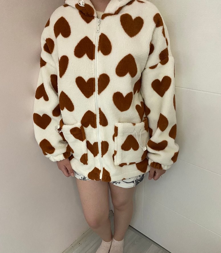 Bol kesim, uzun kollu, kapüşonlu mont. Yumuşak ve sıcak kumaş üzerine kahverengi kalp deseni bulunur. Kürk detaylı ve ön ceplidir.