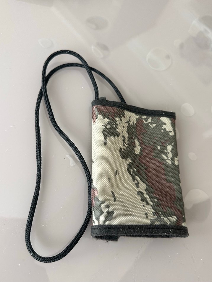 Kahverengi kamuflaj desenli cüzdan sokak stili, cırt cırt kapama ve boyun askısı ile kolay taşınır.