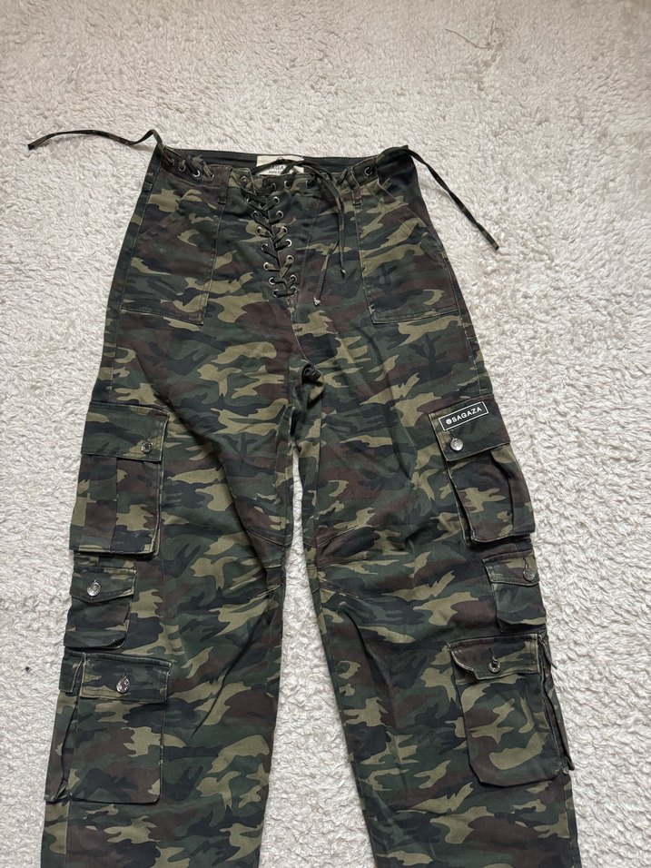 Sentetik kumaştan yapılmış, bel detaylı, bol kesim, kahverengi kamuflaj desenli, çok cepli kadın pantolon.