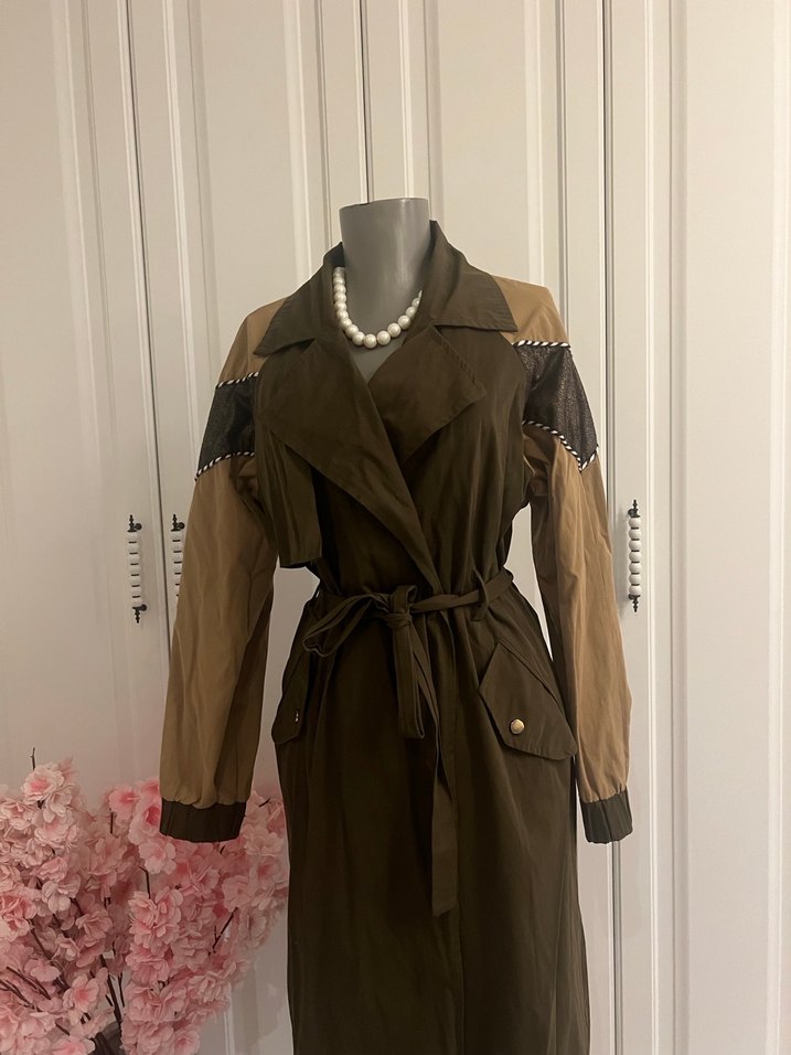 trenchoat 36-38 taşlanmış kot, arkadan yırtmaçlı, 59 kol altı boy 103 cm yandna cepli kollar lastikli 87 kiloya kadar rahat olur belden bağlamalı 300 tl kollar farklı renkUzun, bol kesim kadın trençkot, bel detaylı ve yakalıdır. Deri ve kahverengi kamuflaj desenlidir, uzun kollu ve Paris sokak modası tarzındadır. Günlük kullanıma uygundur.