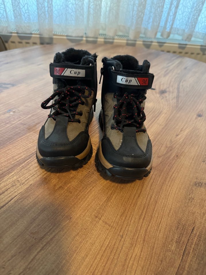 Koyu kahverengi kamuflaj desenli kauçuk erkek botları, cırt cırtlı ve bağcıklı, rahat sokak stili için uygundur. Üzerinde 'Cup' yazısı bulunur.