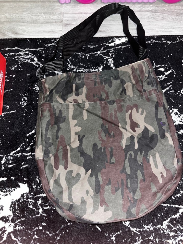 Kahverengi kamuflaj desenli, tokalı kayışlara sahip, sentetik kumaştan üretilmiş günlük kullanıma uygun kadın çantası. Icindeki kumasta kucuk bir yirtik var