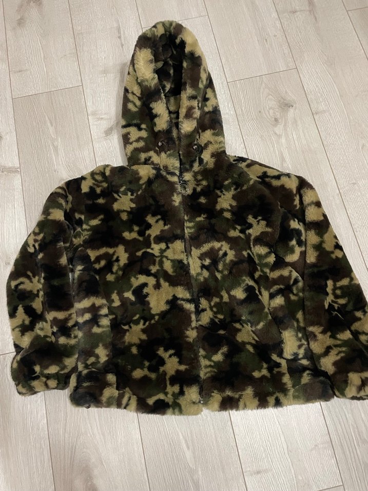 Kahverengi kamuflaj desenli, kapüşonlu ve uzun kollu kadın ceket. Yumuşak ve sıcak dokulu kumaştan, normal kesimdir, günlük kullanım için uygundur.