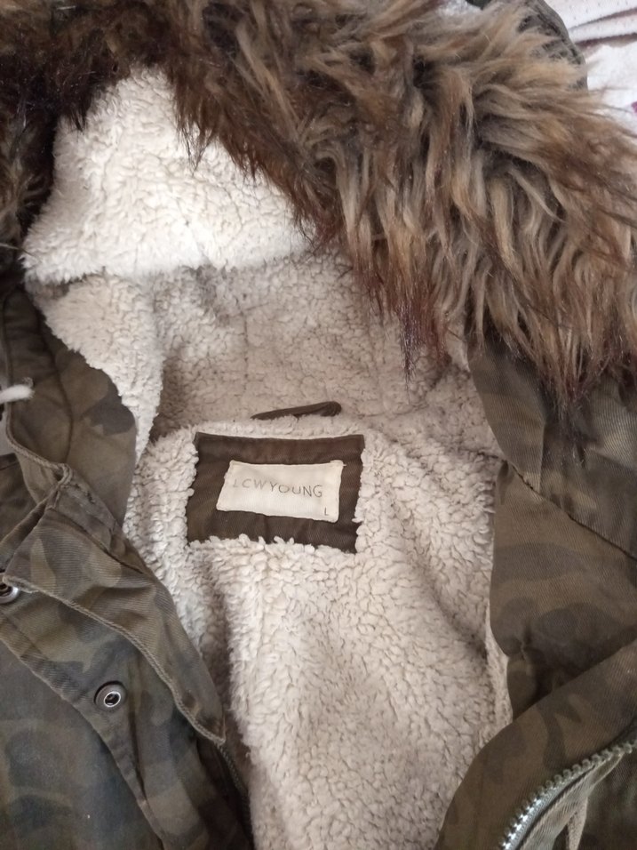 hakki kamuflaj desenli, kapüşonlu ve kürklü detaylı kadın ceket. Yumuşak ve sıcak astarlı, bol kesim ve midi boyda, günlük rahat kullanıma uygun.