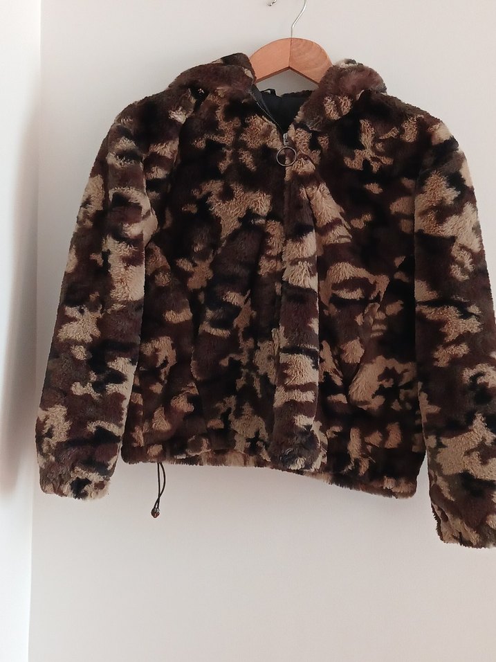Kahverengi kamuflaj desenli, kapüşonlu ve uzun kollu bu kürk ceket, yumuşak fleece kumaştan üretilmiştir. Rahat kesimi ve midi boyu ile dış mekan kullanımı için uygundur.