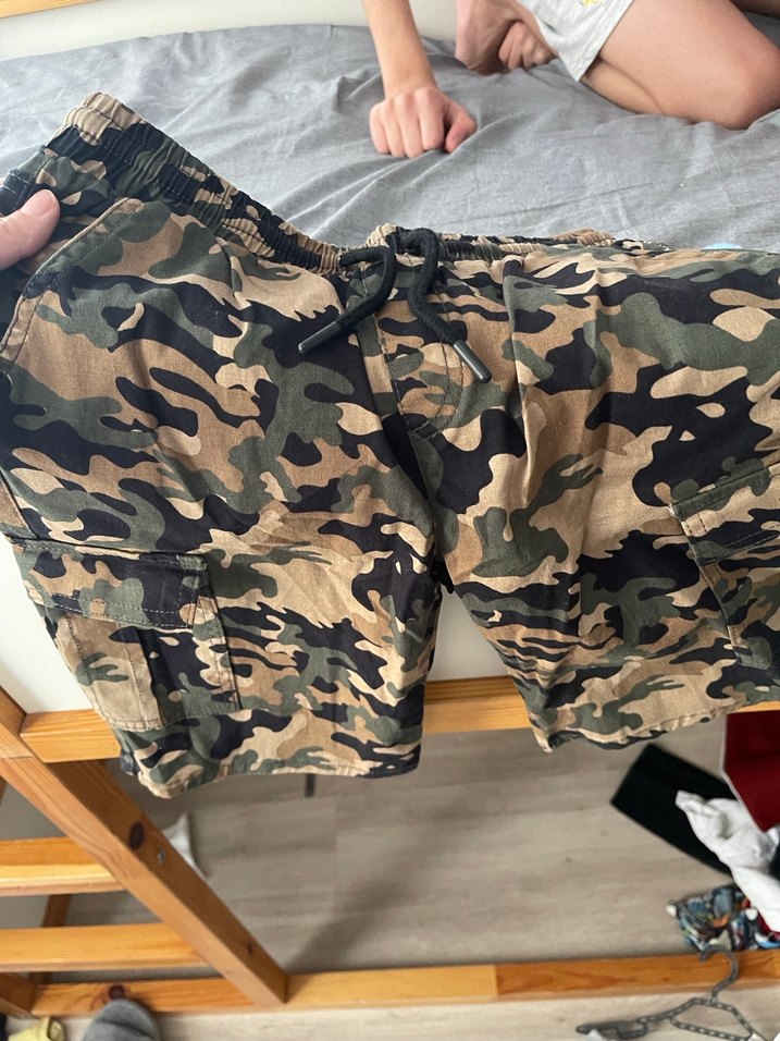 Koyu kahverengi kamuflaj desenli, sentetik kumaştan, bol kesim erkek mini pantolon. Tokalı detaylara sahip, sokak stili ve açık hava kullanımı için uygundur. 4 5 yaş yazıuor ama kesınlıkle 6 7 yaşa olur kalıp büyük hiç giyilmedi