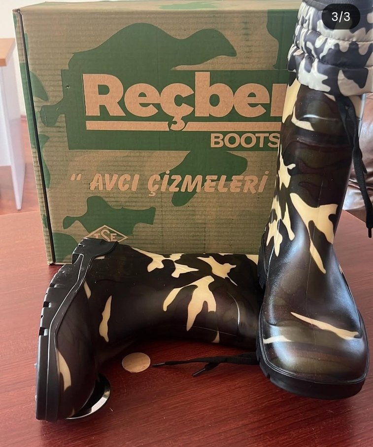 Kahverengi kamuflaj desenli, tokalı kauçuk botları. Reçbel markasına ait, rock punk tarzında sokak modası botları. Av çizmesi