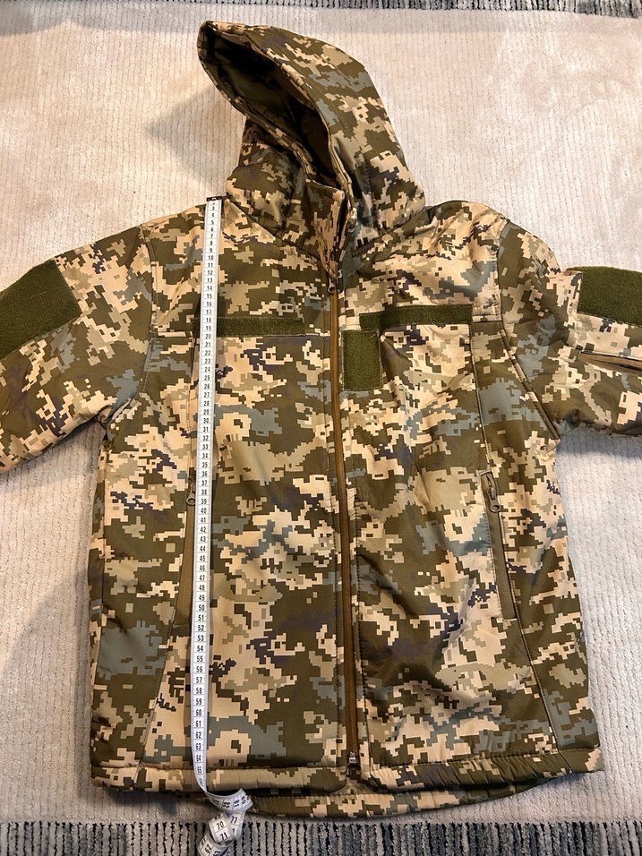 Bu erkek mont, kahverengi kamuflaj desenli, fermuarlı ve kapüşonlu. Uzun kollu, notched lapel yakalı, midi boyda ve yumuşak sıcak kumaştan yapılmıştır.
