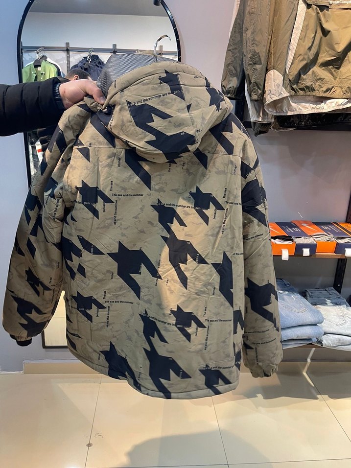 Kahverengi kamuflaj desenli, kapüşonlu ve kürklü detaylı erkek ceket. Sentetik kumaştan, bol kesim, uzun kollu ve midi boydadır. Outdoor ve sokak stili için uygundur.