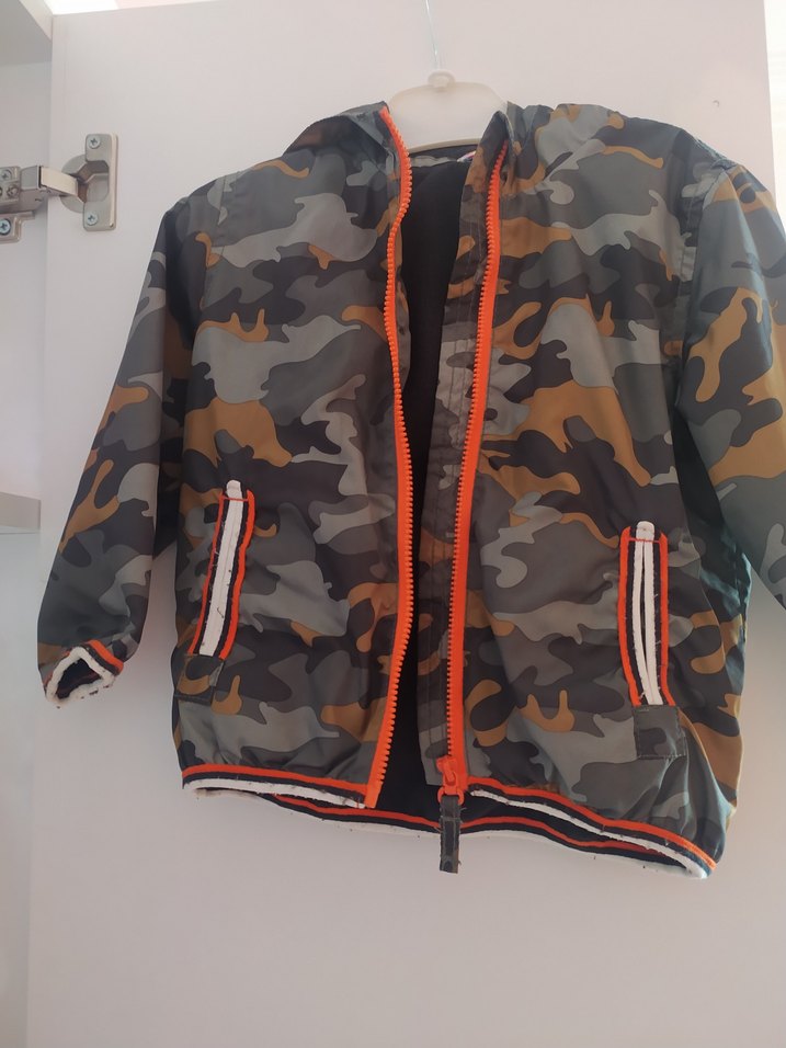 Kahverengi ve gri kamuflaj desenli, kapüşonlu ve bol kesim erkek çocuk ceketi. Fermuarlı kapama ve sıcak tutan yumuşak kumaşla rahatlık sağlar.