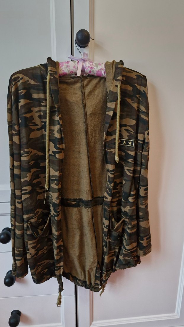 Kahverengi kamuflaj desenli, kapüşonlu ve uzun kollu kadın ceket. Orta boy ve bol kesim, bel kemeri ile tamamlanmıştır. Yumuşak dokulu kumaştan üretilmiştir.