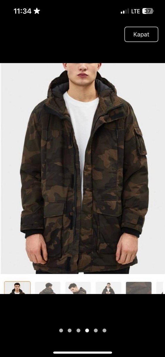 Bu erkek montu koyu kahverengi kamuflaj desenli, bol kesim ve kesik yakalıdır. Uzun kollu ve kemerlidir, yumuşak ve sıcak kumaştan outdoor kullanıma uygundur.