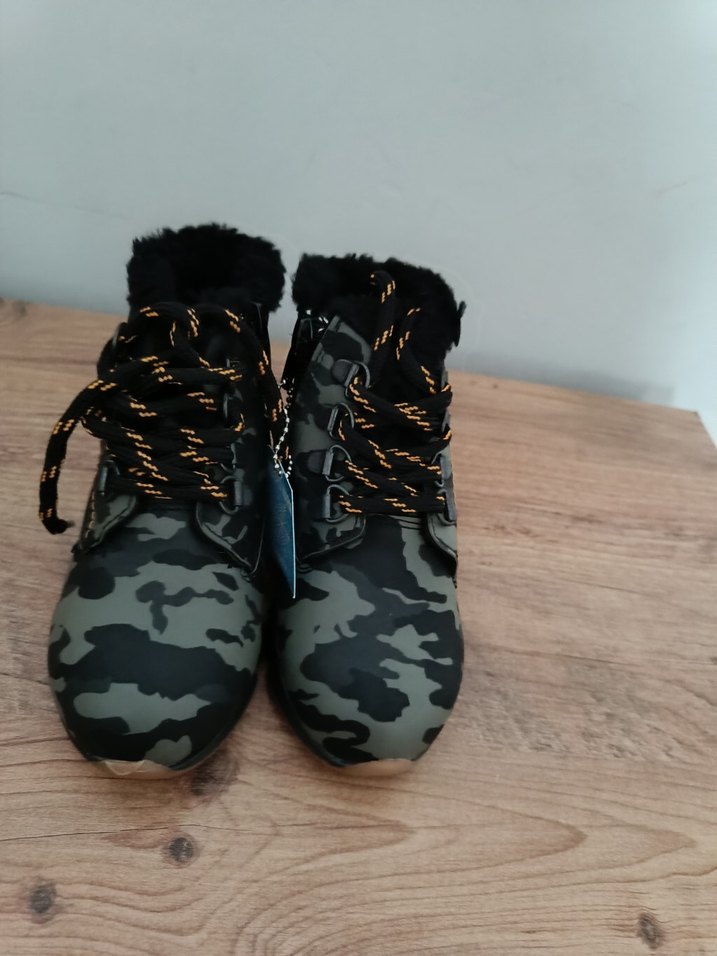 kutusunda Kahverengi kamuflaj desenli çocuk botu, kürk detaylı ve trend sokak stili için uygundur.