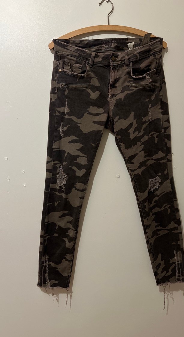 Kahverengi kamuflaj desenli bol kesim kot pantolon, kemerli ve yıpranmış detaylıdır. Midi boyda, dış mekan kullanımı için uygundur.