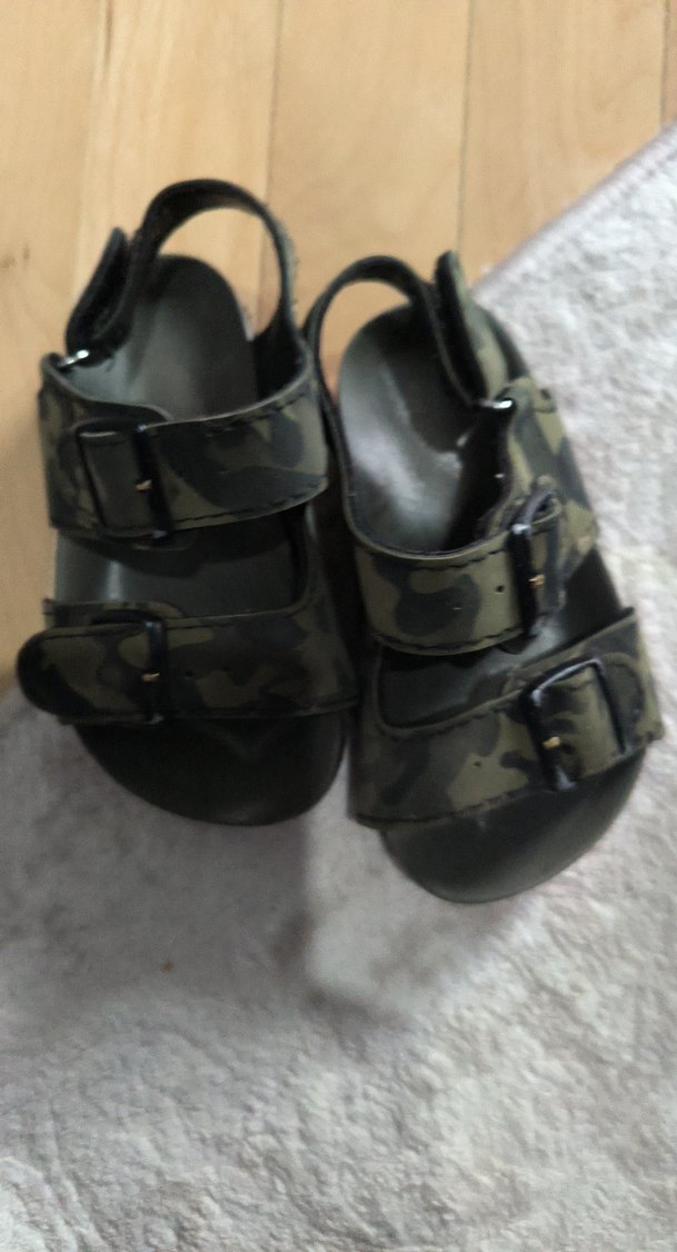 Kahverengi kamuflaj desenli, tokalı ayarlanabilir bantlara sahip kauçuk erkek sandaletleri. Sokak stili ve rock punk havası taşır.
