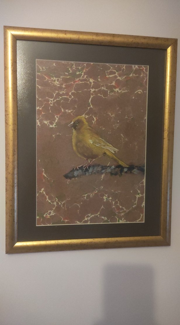 Altın renkli çerçevede, dalda tüneyen sarı kanarya kuşunu gösteren koyu kahverengi tablo. ️Ebru kağıdı üzerine yağlıboya çalışmalarım