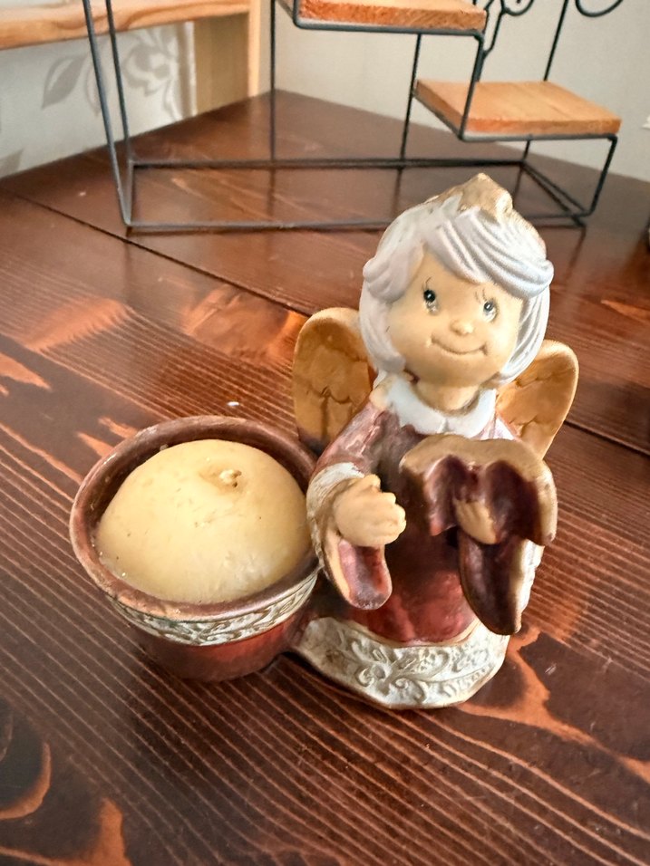 Kanatlı, gülen yüzlü kahverengi melek biblo, elinde kalp tutuyor, yanında küçük yuvarlak mumluk bulunuyor. ️