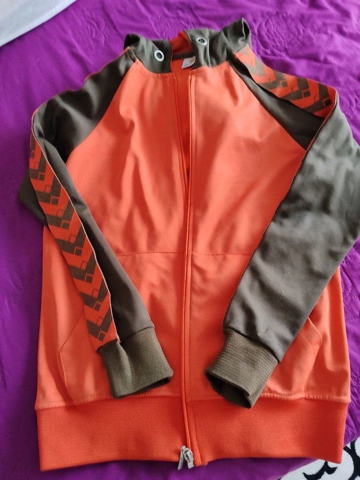 Fermuarlı, uzun kollu, yüksek yakalı, kahverengi ve turuncu renklerde, yumuşak kumaştan yapılmış, normal boyda