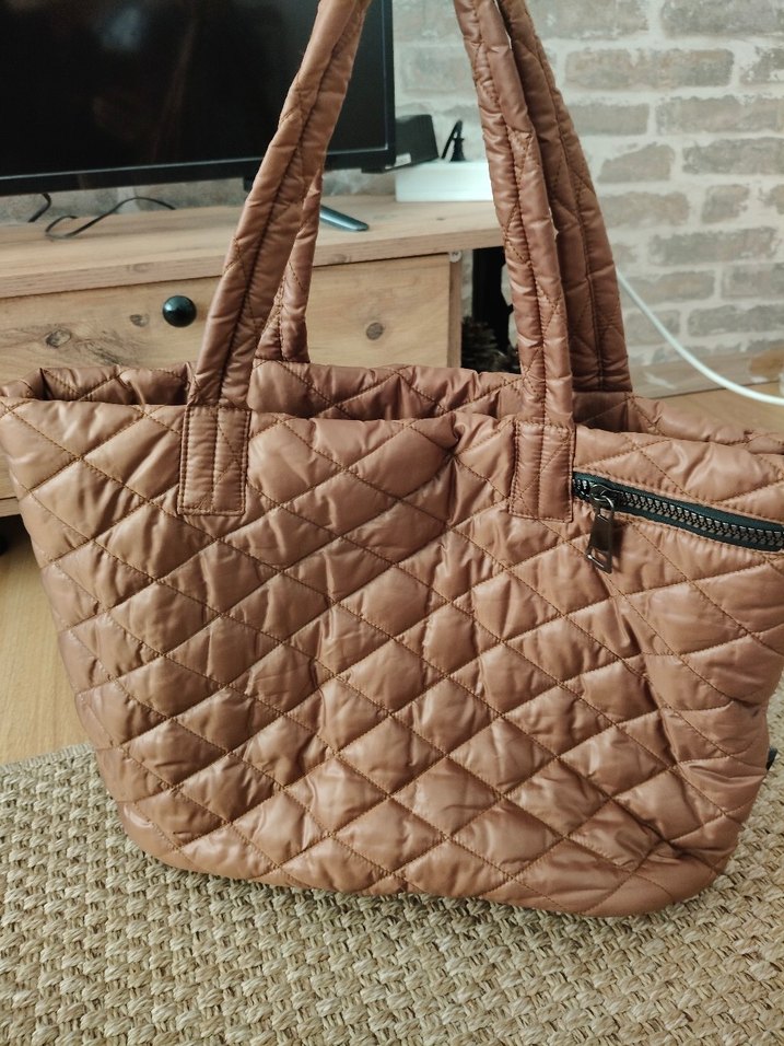 Kahverengi kapitone sentetik kumaştan, fermuarlı cep detaylı, parlak görünümlü kadın çantasıdır.