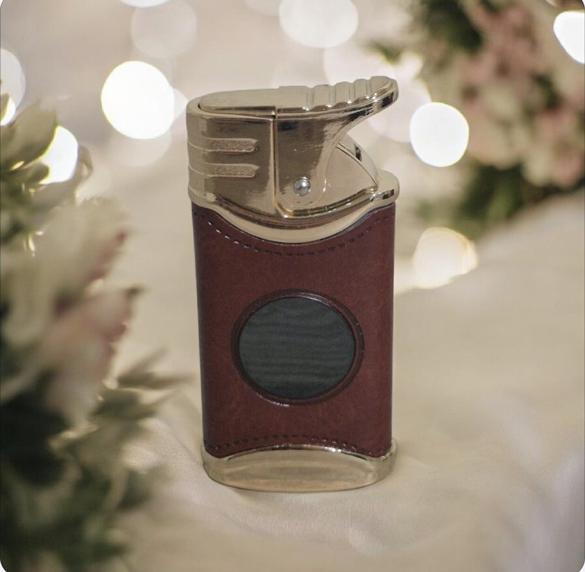 Bu çakmak, metal detaylarla tamamlanmış koyu kahverengi deri kaplamaya sahiptir.