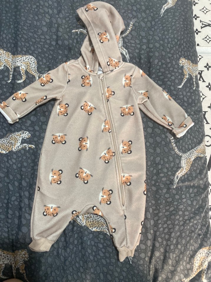(Satıldı) Kapüşonlu ve fermuarlı kahverengi bebek tulumu, baskılı kaplan desenli ve kürk detaylıdır. Soğuk havalar için yumuşak ve sıcak kumaştan yapılmıştır.
