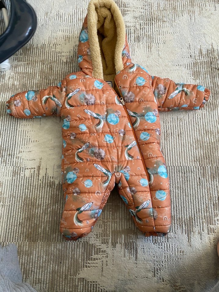 Kapüşonlu ve yumuşak kürk detaylı, pastel kahverengi batik desenli bebek tulumu ❄️