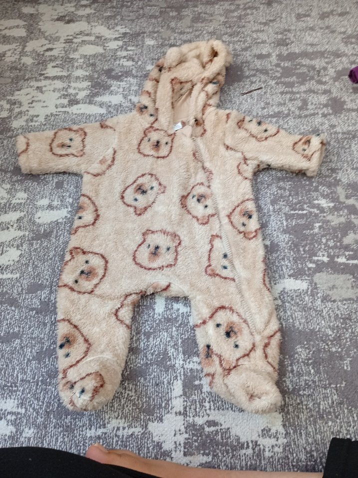 Yumuşak ve sıcak kumaştan yapılmış, kapüşonlu ve ayıcık desenli kahverengi bebek tulumu. Kapüşonunda kürk detayları bulunur.