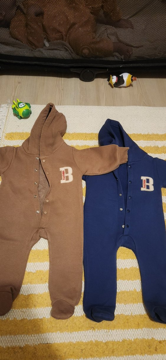 Kahverengi kapüşonlu bebek tulumu, düğmeli ve yumuşak, sıcak kumaştan yapılmıştır. Nakışlı 'B' detayıyla sokak stiline uygun. 2 adet fiyatıdır. Temizdir
