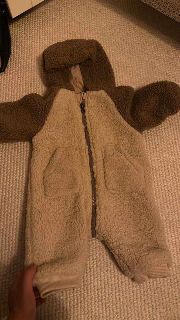 Yumuşak ve sıcak kumaştan yapılmış, kapüşonlu ve kürk detaylı kahverengi bebek tulumu. ❄️