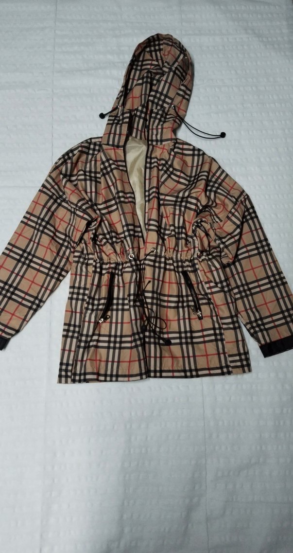 Kapüşonlu, uzun kollu ve belden bağlamalı kahverengi kareli desenli, bol kesim kadın yağmurluk. Günlük kullanım için uygundur. Bir veya iki defa giyildi
