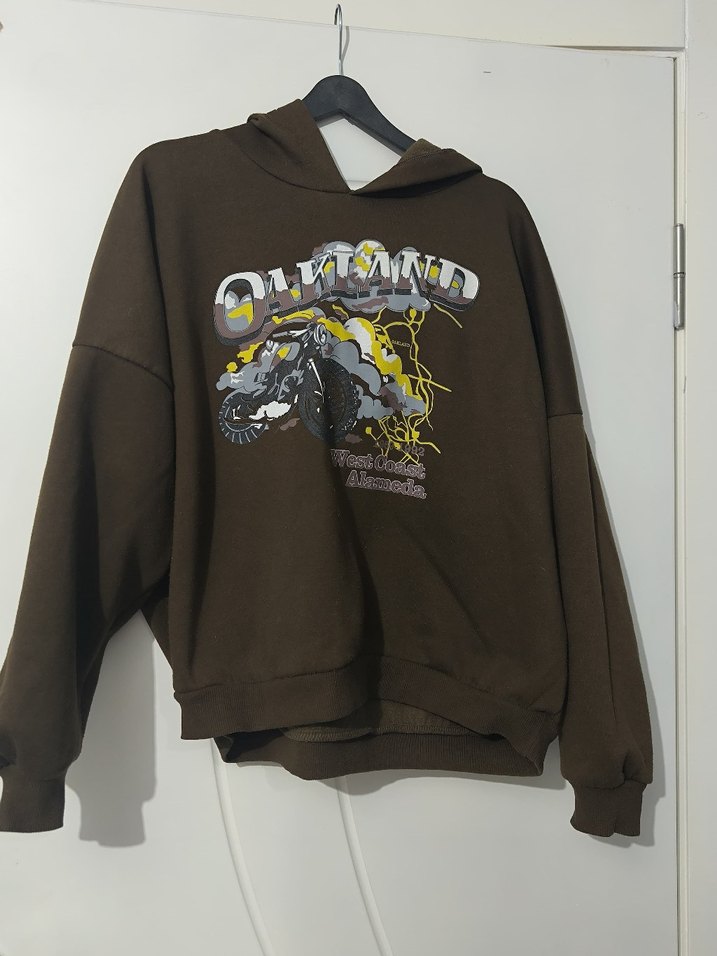m nedense olur oversize giyiyosa s de olurKoyu kahverengi kapüşonlu sweatshirt, uzun kollu ve bol kesimdir. Fermuarlı, baskılı biker desenli, dış mekan kullanıma uygun yumuşak ve sıcak kumaştan yapılmıştır. ️