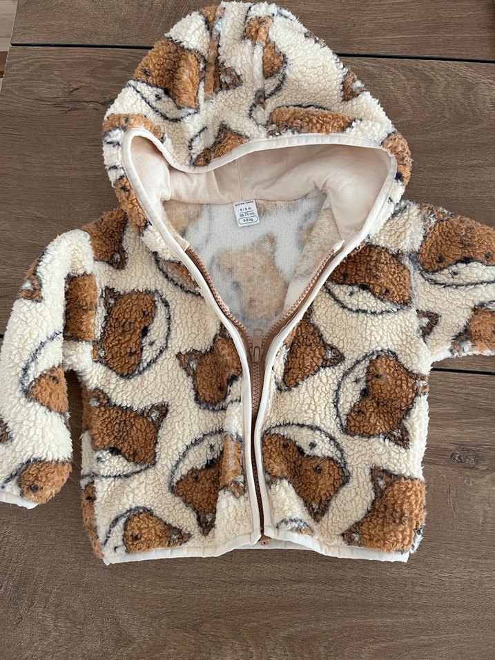 Kapüşonlu, bol kesim erkek çocuk ceketi, yumuşak ve sıcak kumaştan, kahverenginin açık tonlarında baskılı ve kürk detaylıdır.