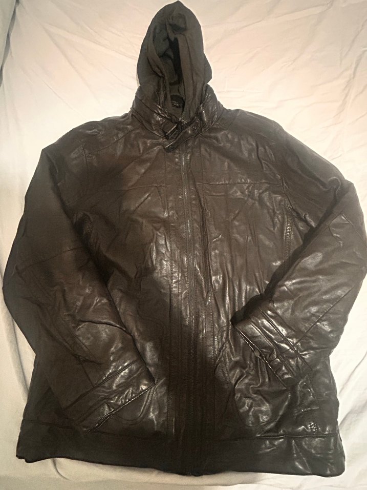 Bu kahverengi kapüşonlu suni deri erkek ceket, fermuarlı ve dar kesim olup sokak stili ve açık hava kullanımı için uygundur. İçi kürklü. Çok az giyildi, herhangi bir kusuru yoktur.