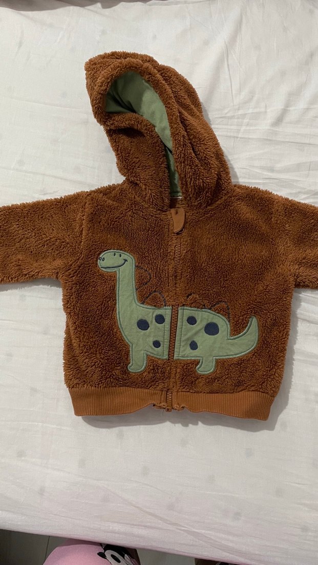 Kapüşonlu ve fermuarlı, yumuşak ve sıcak kumaştan yapılmış, önünde nakış dinozor desenli kahverengi erkek çocuk ceketi. Sokak stili için uygun. Bir kış kullanıldı yeni duruyor 6 9 ay uygun