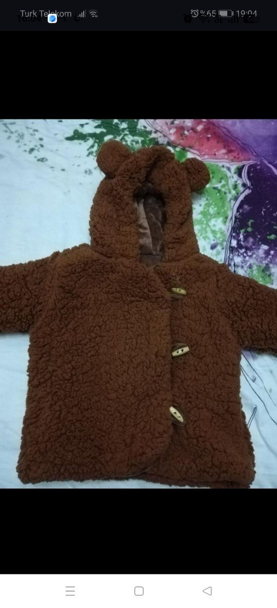 Kapüşonlu ve kulak detaylı, yumuşak ve sıcak dokulu kahverengi erkek çocuk kabanı. Düğmeli kapama ve rahat sokak stili sunar.