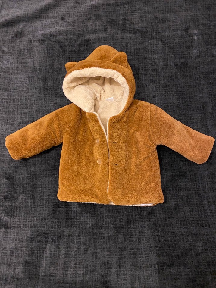 Kahverengi kapüşonlu, yumuşak ve sıcak kumaştan, kürk detaylı, sade ve düz desenli erkek çocuk kabanı. Hiç giyilmedi sadece denendi olmadı küçük geldi o yüzden satıyorum .