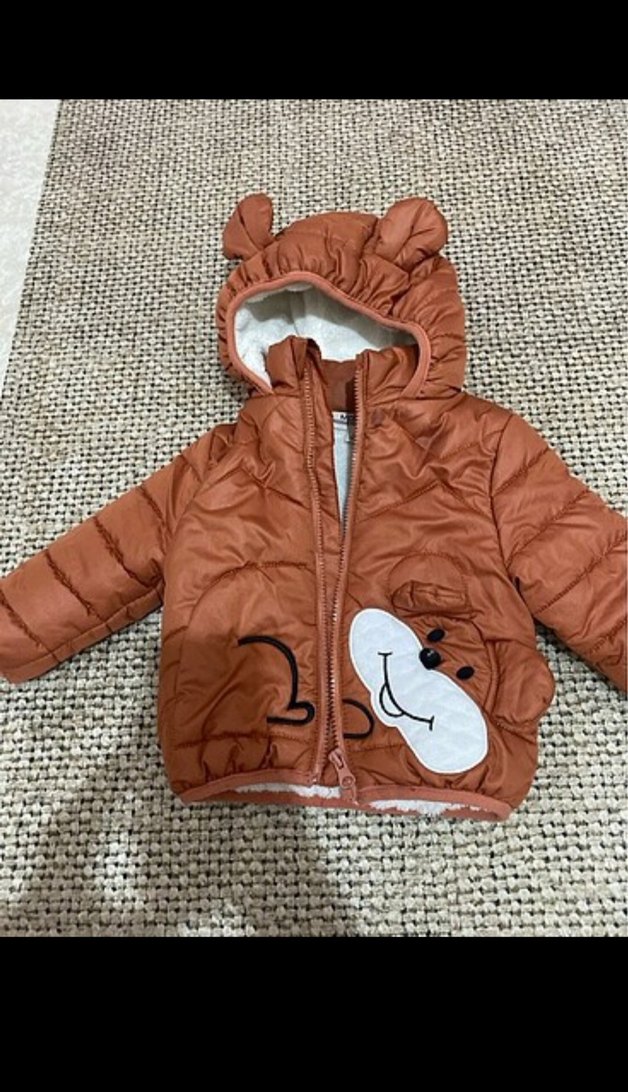 Kahverengi, kapüşonlu ve kulak detaylı çocuk montu, parlak kumaş, içi kürklü ve ön cepte nakışlı sevimli yüz deseni içerir.