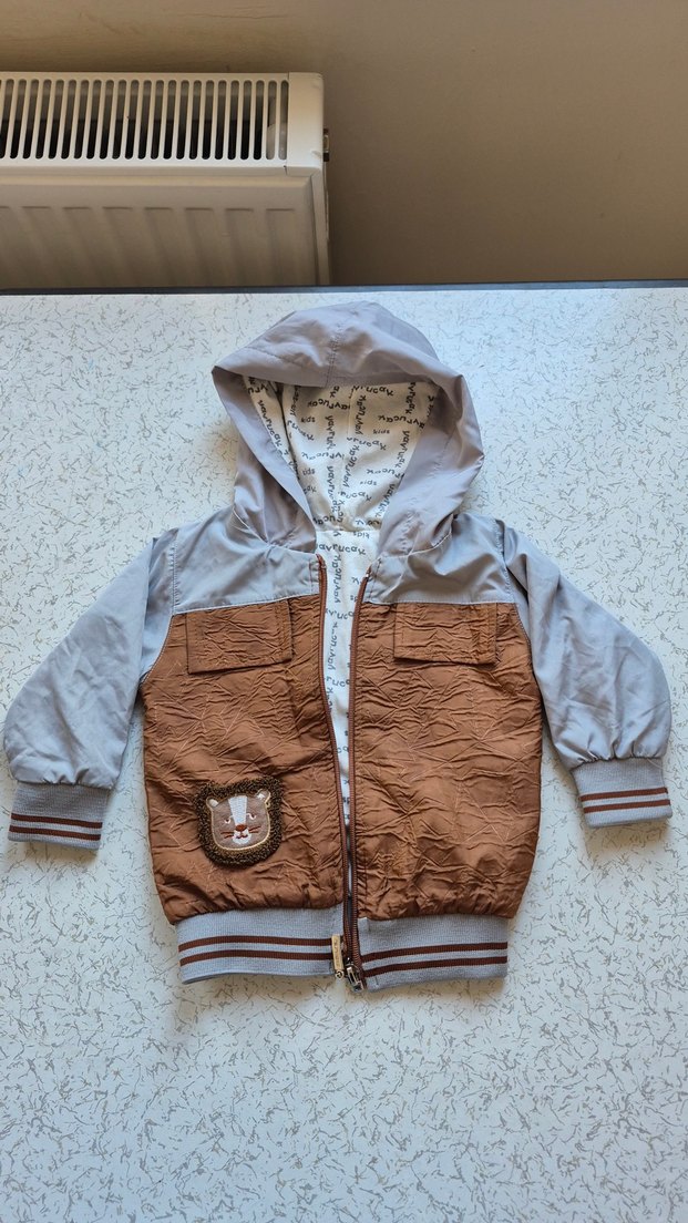 Kapüşonlu ve bol kesimli bu erkek çocuk montu, kahverengi ve gri renklerin birleşimiyle sokak stili sunar. yumuşak kumaştan üretilmiştir.