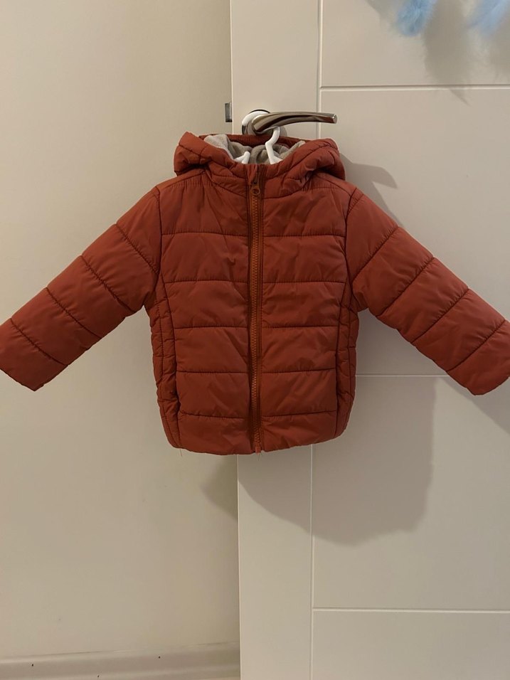 Kahverengi, kapüşonlu ve fermuarlı, yumuşak ve sıcak kumaştan yapılmış erkek çocuk montu.